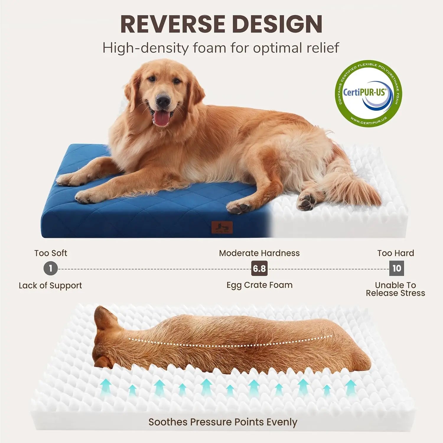 - Orthopedic egg-crate foam conforms to your dog’s body, easing joint and muscle pressure while promoting deep, restorative sleep—especially helpful for seniors, large breeds, or arthritis.